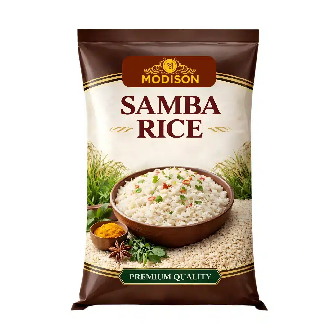 MODISON Samba Rice is a high-quality traditional rice variety that is valued for its special smell, short grains, and good cooking qualities. This rice variety itself has excellent properties that make it further suitable for cooking. This rice is surely sourced from reliable rice-growing areas and processed hygienically to keep it pure and fresh. Moreover, careful processing ensures consistent quality in every batch. Basically, when you cook Samba Rice, it becomes soft and fluffy with good taste, so people use the same rice for their daily meals.
